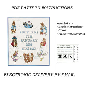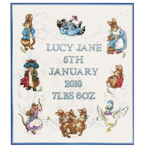 Kit d'annonce de naissance de bébé au point de croix compté vintage rare Beatrix Potter Peter Rabbit & Friends Échantillon de souvenir ou tableau de motifs PDF Instructions JC218 par Anchor 2010