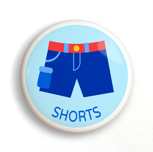 Le bouton en céramique de 2" présente un short rayé pour garçon sur un fond bleu.
