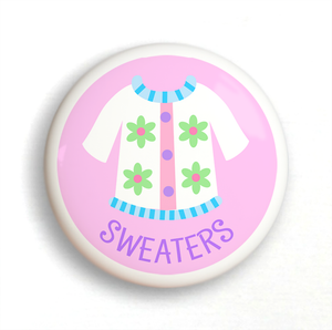 Le bouton en céramique de 2" présente un pull blanc avec des fleurs sur un fond rose.
