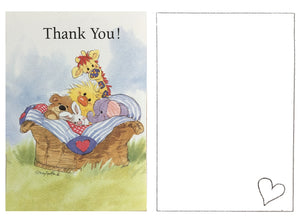 Carte de remerciement avec enveloppe représentant des bébés animaux du zoo de Little Suzy dans un panier - Canard, ours, lapin, girafe, éléphant