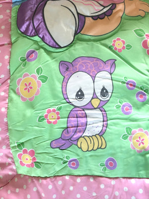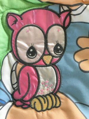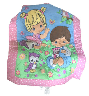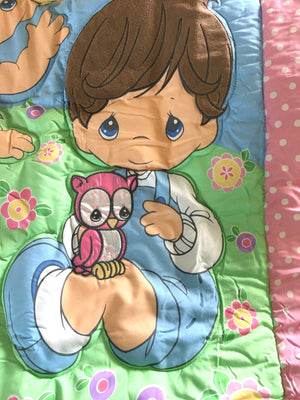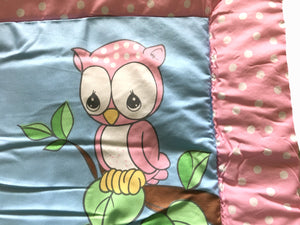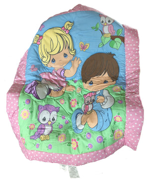 Cette literie de berceau vintage Precious Moments avec des appliques en peluche et des ornements en tissu satiné présente une scène d'un bébé garçon et d'une fille avec d'adorables hiboux dehors dans la nature.