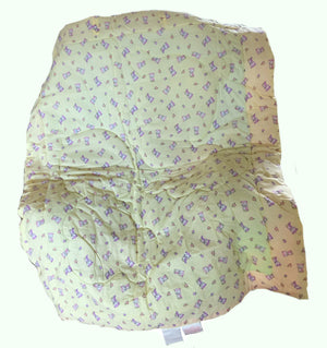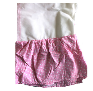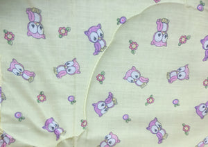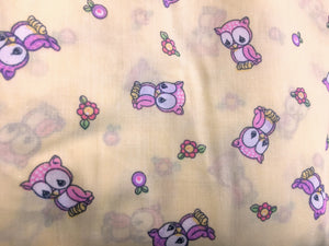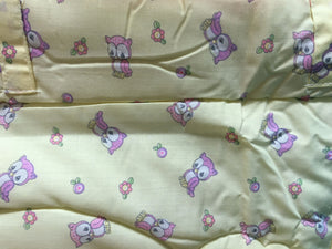 Les cheveux du garçon et de la fille sont faits d'une matière en peluche douce . Le hibou sur les genoux du garçon, les chaussures et la couche de la fille sont en matière satinée douce et brillante. L'imprimé à pois roses et blancs sur la couette et la jupe de lit complète la literie. Le dos de la couette et du drap de lit est jaune avec un imprimé hibou violet.