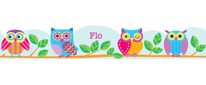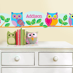 Bordure de papier peint autocollante et personnalisée pour enfants, motif hiboux roses et bleus sur une branche d'arbre
