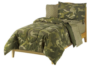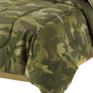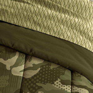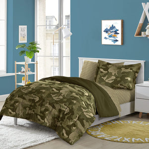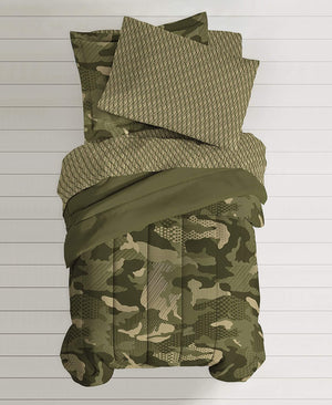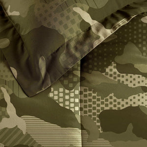 Cet ensemble de literie à motif camouflage vert saura satisfaire tous les amateurs de l'armée! La face de la couette et les taies d'oreiller standard présentent un motif de camouflage numérisé sur toute la surface dans des tons de vert forêt, olive et kaki; l'envers de la couette est vert olive uni. Les draps et taies d'oreiller à 180 fils présentent un motif géométrique sur toute la surface imitant un maillon de chaîne, dans des tons d'olive et de forêt sur un fond kaki. Tous les composants sont fabriqués à partir d'un mélange facile d'entretien de 60 % coton et de 40 % polyester et sont lavables en machine.