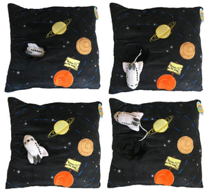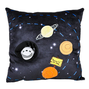 Coussin décoratif en peluche noir Outer Space 13" avec jouet fusée attaché Galaxy Solar System