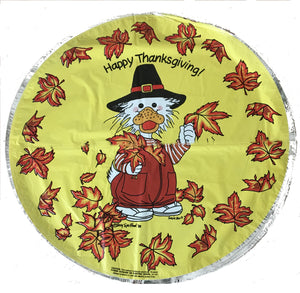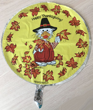 Ce ballon vintage du zoo de Suzy représente un canard blanc habillé en pèlerin tenant des feuilles d'automne dans ses mains et des feuilles éparpillées autour du contour, le tout sur un fond jaune. Ballon vintage unique en son genre, difficile à trouver et un objet de collection.