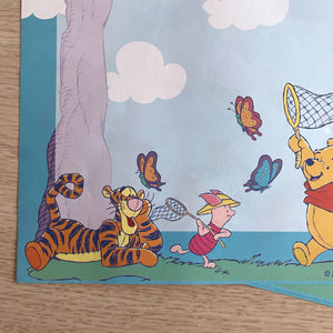 Cet adorable ensemble de papeterie vintage Winnie l'ourson présente Winnie et ses amis Tigrou et Porcinet dehors près de l'arbre, Porcinet et l'ours Winnie tenant des filets et chassant des papillons pendant que Tigrou regarde. Fond bleu clair avec contour bleu sarcelle plus foncé et imprimé nuage. Adorable à envoyer à quelqu'un en guise de note ou à garder dans votre collection.
