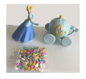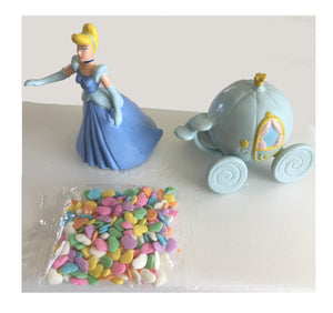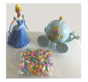 • Comprend : 1 figurine de Cendrillon de 3" de haut x 1 3/4" de diamètre à la base, 1 carrosse de 3" de long x 1 3/4" de large x 2 1/4" de haut, 1 sac de bonbons à saupoudrer