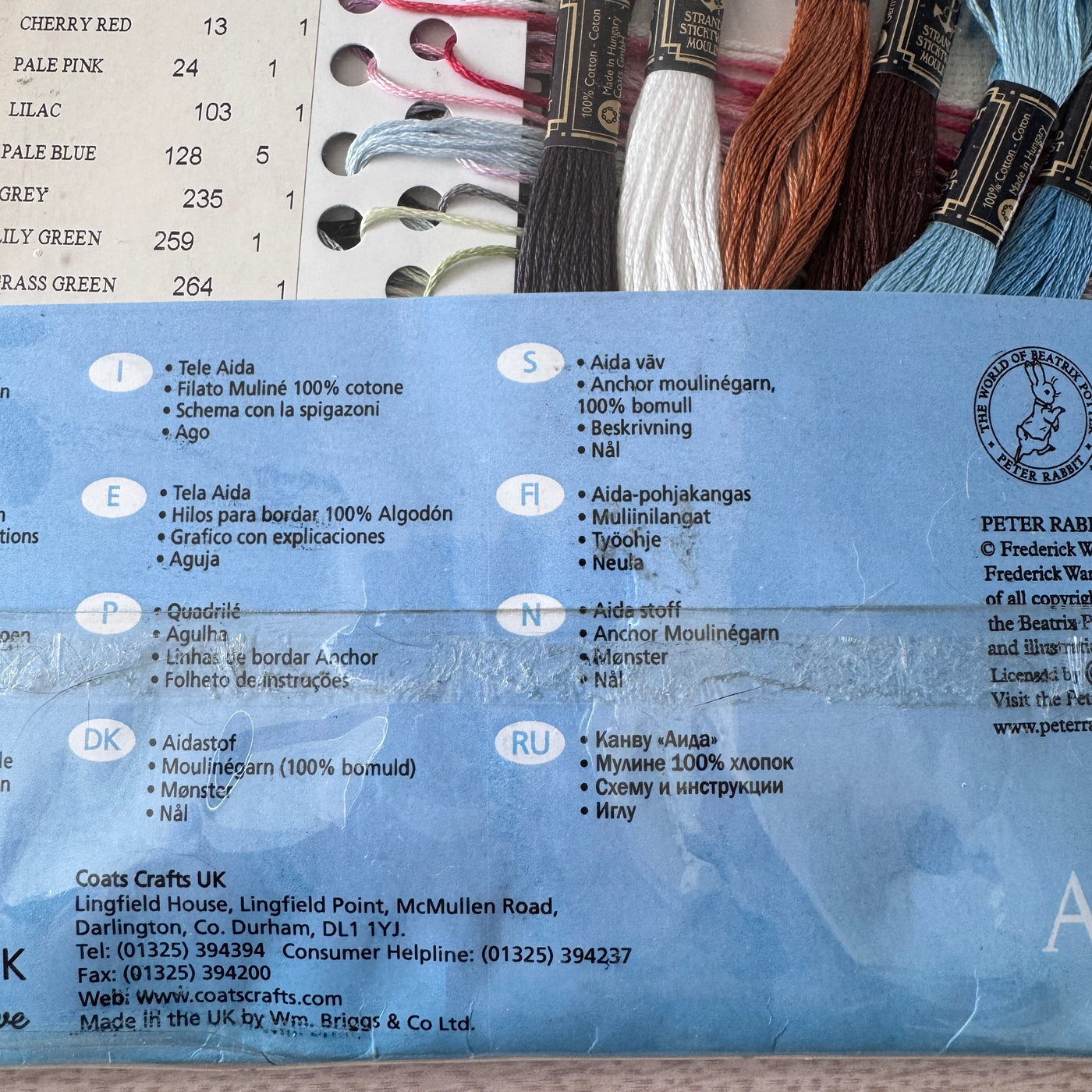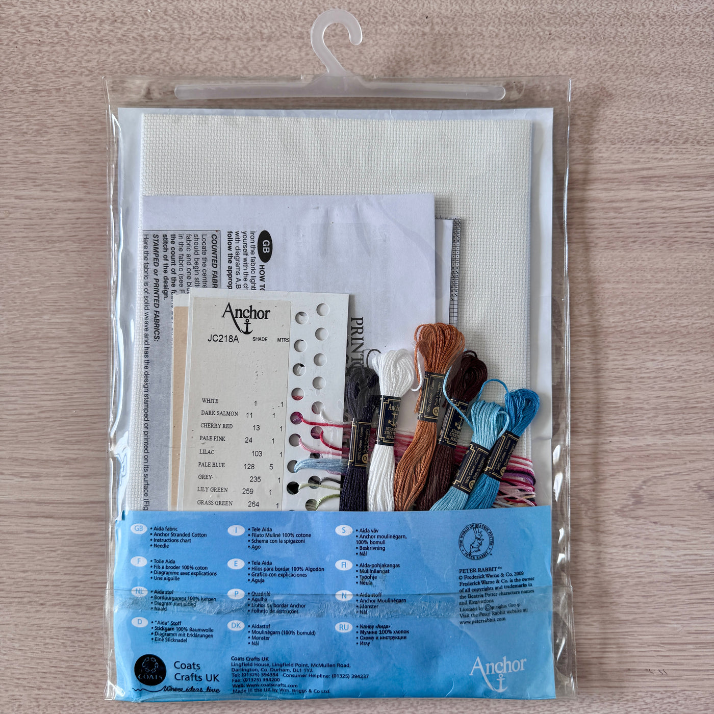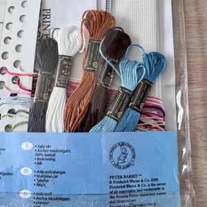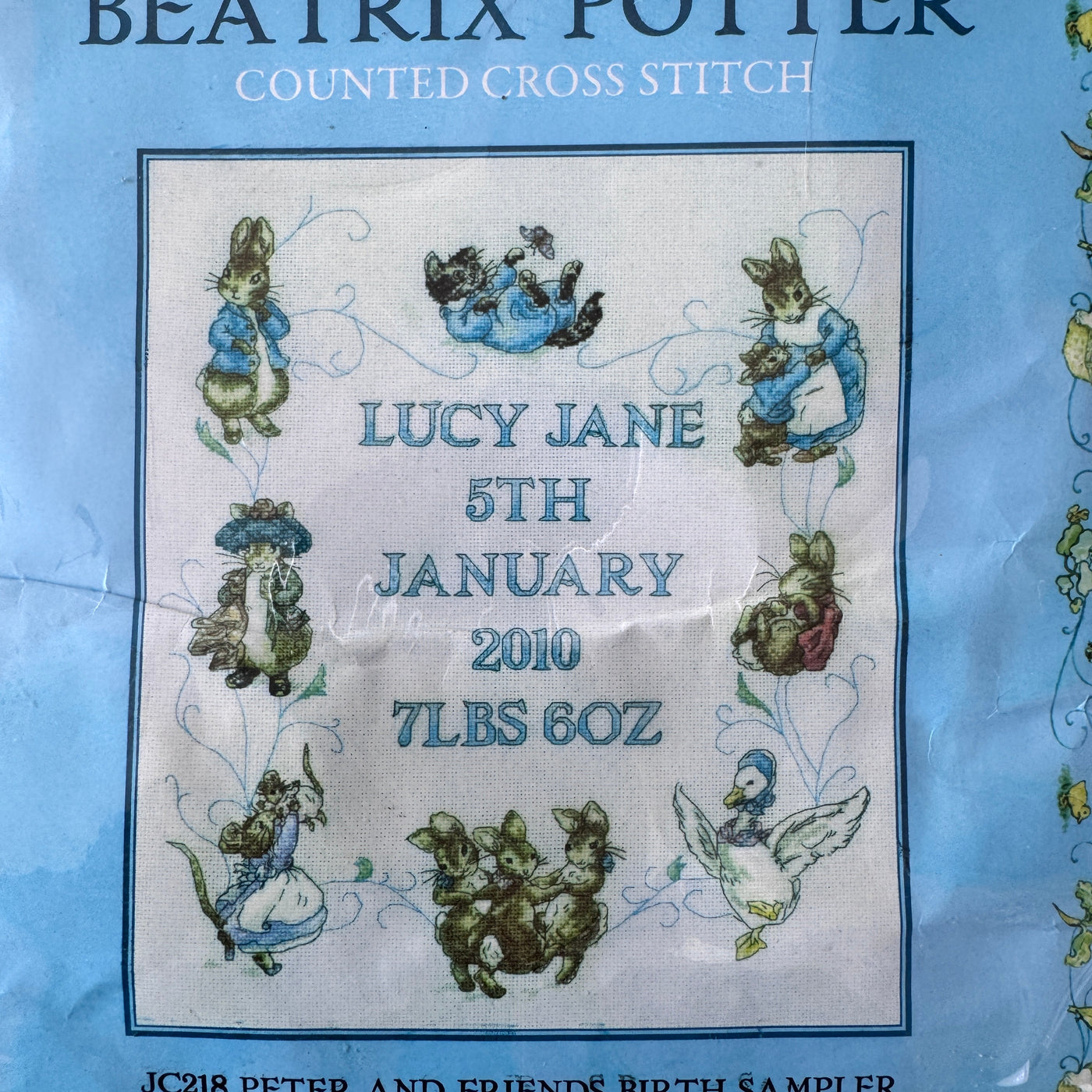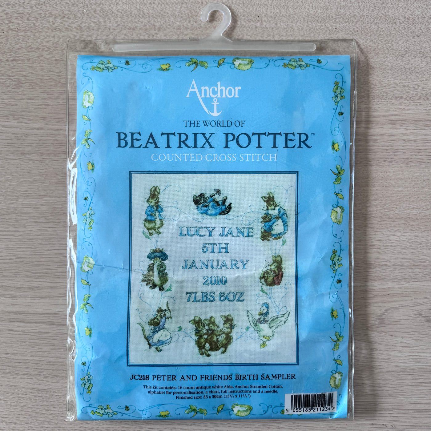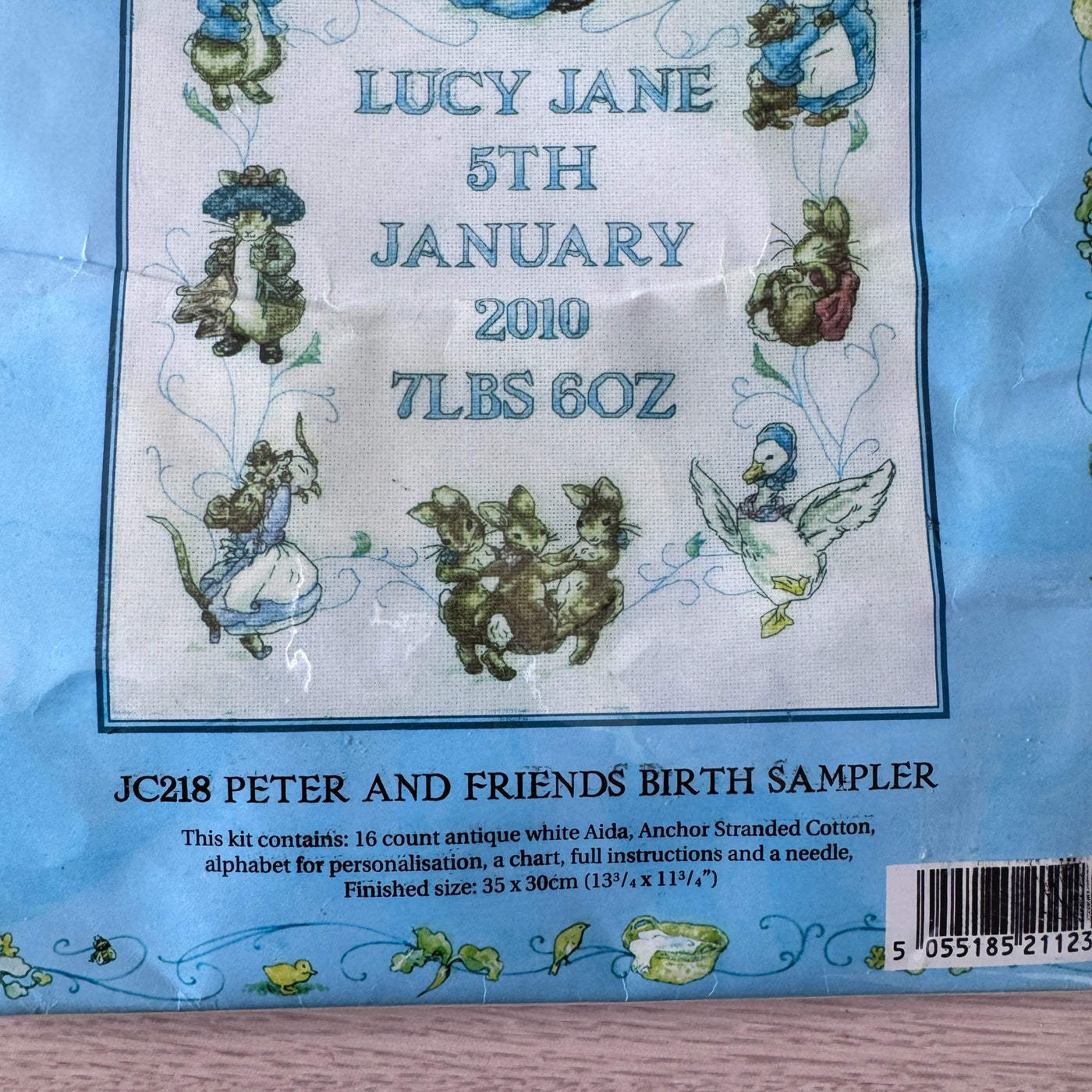 Kit d'annonce de naissance de bébé au point de croix compté vintage rare Beatrix Potter Peter Rabbit & Friends Échantillon de souvenir ou tableau de motifs PDF Instructions JC218 par Anchor 2010