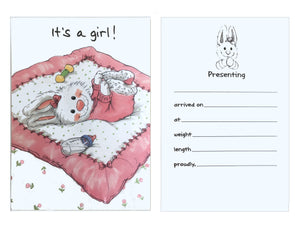 Cette adorable carte d'annonce de naissance vintage présente un bébé lapin nouveau-né en rose avec un jouet et un biberon sur une couverture souriant joyeusement et annonçant « C'est une fille ! »