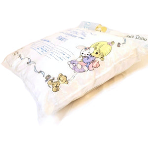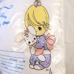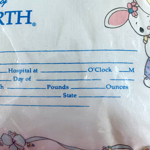 Cet adorable oreiller « Certificat de naissance » pour bébé, vintage et flambant neuf, est orné d'images d'enfants Precious Moments, un garçon tenant un ours et une fille tenant un lapin, debout de chaque côté de l'oreiller, avec des jouets en forme de lapin et d'ours dans chaque coin inférieur et des nœuds et des rubans sur le contour, encadrant le centre. Le centre de l'oreiller comporte un espace pré-imprimé pour inscrire le nom de l'enfant, les parents, l'hôpital, le médecin, le sexe, le poids et la taille du bébé. Cet adorable oreiller souvenir serait un excellent cadeau de baby shower.