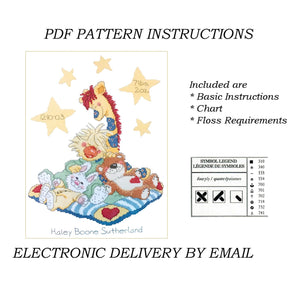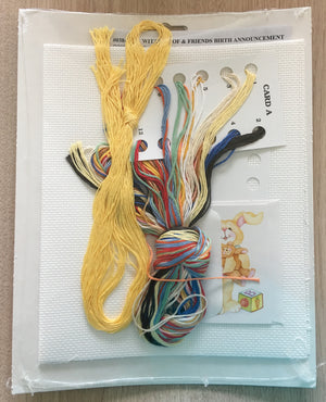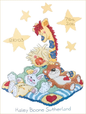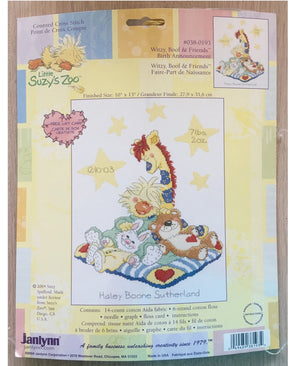 Kit d'annonce de naissance au point de croix compté Little Suzy's Zoo vintage 2004, animaux endormis sur une couverture, échantillon souvenir, canard et ours, girafe, lapin, Janlynn 038-0193